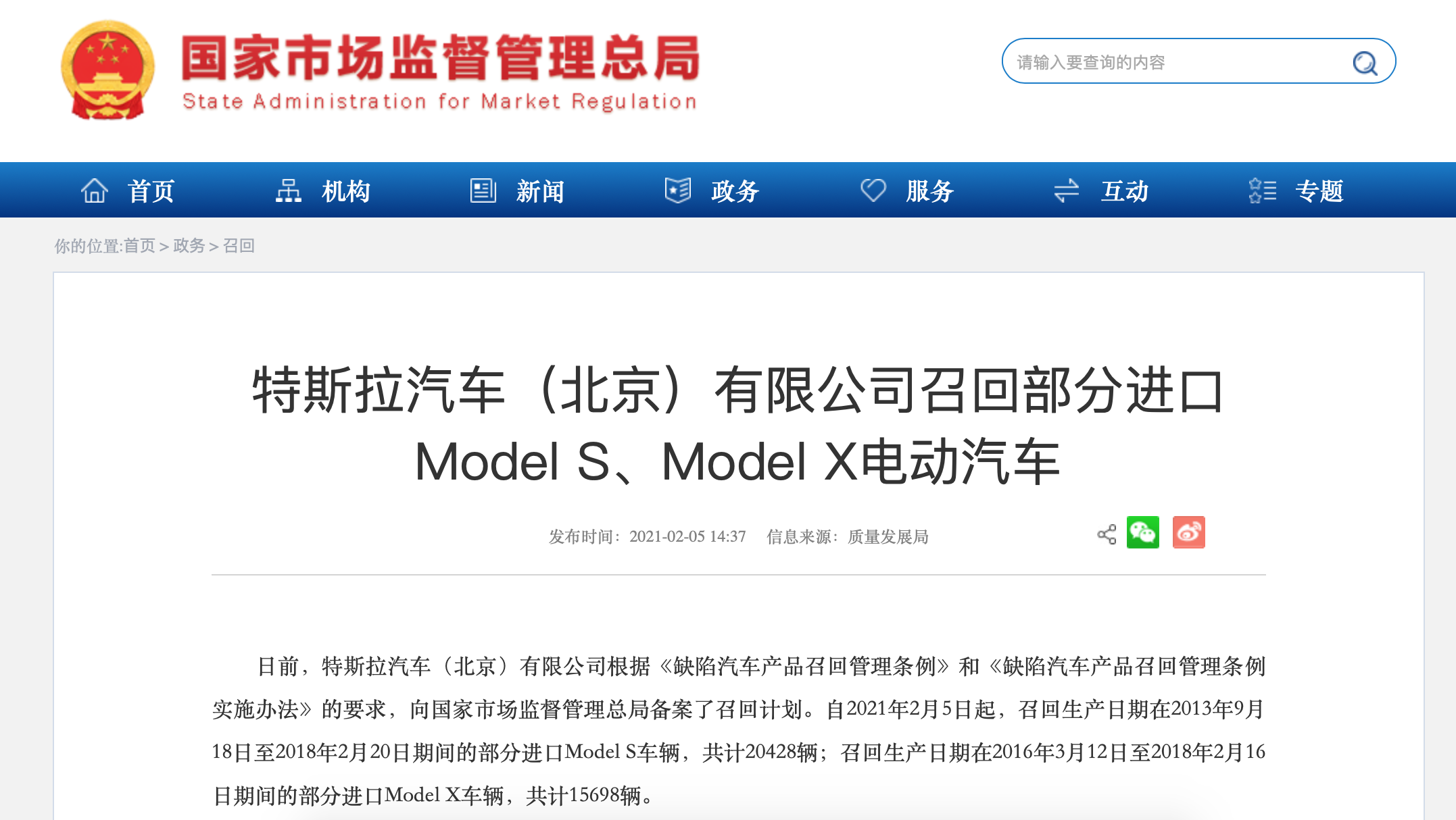 央廣網(wǎng)北京2月5日消息(記者 張圣琪)今日,國家市場監(jiān)督管理總局在其官網(wǎng)發(fā)布《特斯拉汽車(北京)有限公司召回部分進口Model S、Model X電動汽車》的公告稱,日前,特斯拉汽車(北京)有限公司根據(jù)《缺陷汽車產(chǎn)品召回管理條例》和《缺陷汽車產(chǎn)品召回管理條例實施辦法》的要求,向國家市場監(jiān)督管理總局備案了召回計劃。
