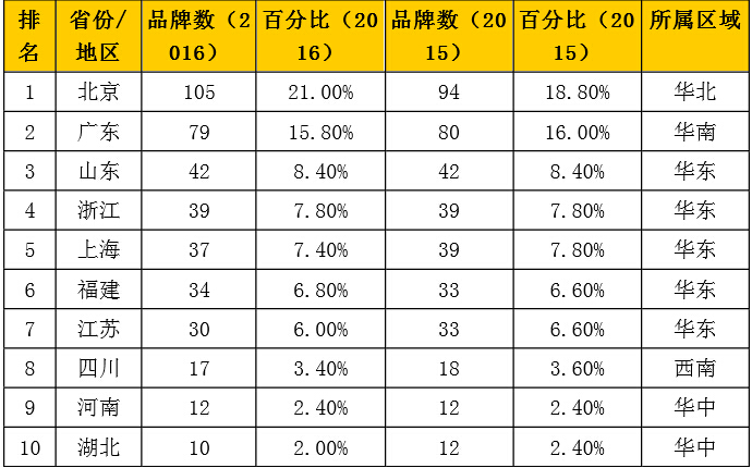 2016年《中國(guó)500最具價(jià)值品牌》區(qū)域分布(前10名省市)