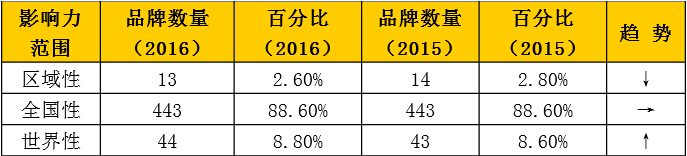 2016年《中國(guó)500最具價(jià)值品牌》影響力范圍分布