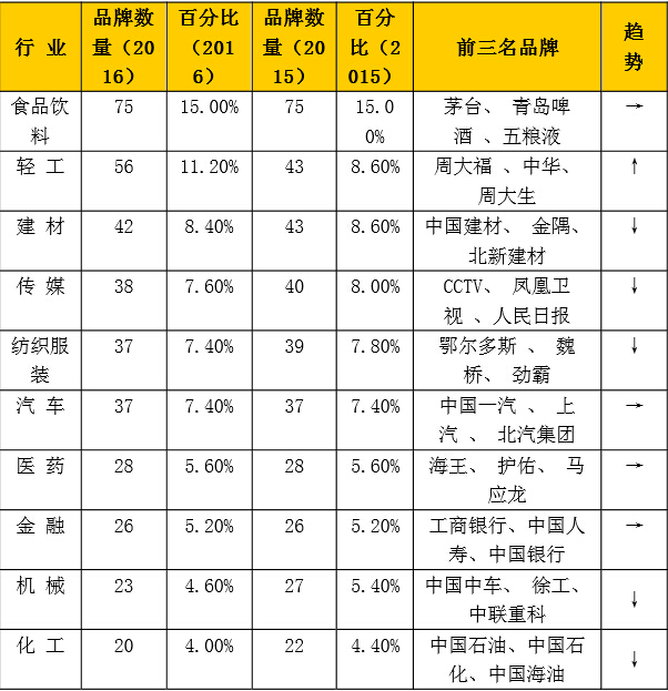 2016年《中國(guó)500最具價(jià)值品牌》行業(yè)分布(前10名行業(yè))
