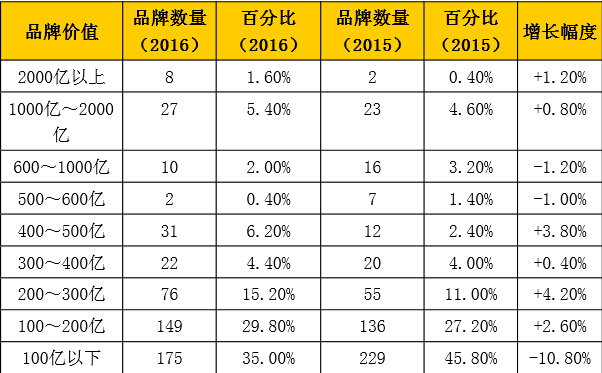 2016年《中國(guó)500最具價(jià)值品牌》價(jià)值范圍分布