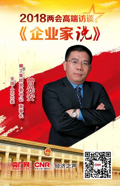 3月10日18:00-19:00,全國人大代表,柳工集團(tuán)黨委書記、董事長曾光安做客中央人民廣播電臺(tái)經(jīng)濟(jì)之聲2018兩會(huì)高端訪談《企業(yè)家說》。經(jīng)濟(jì)之聲、央廣網(wǎng)同步直播,敬請(qǐng)關(guān)注!