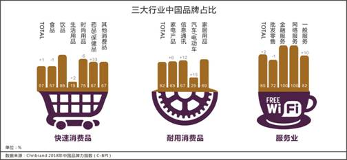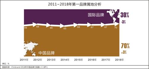 在第一品牌陣營(yíng)內(nèi),中國(guó)品牌的數(shù)量和行業(yè)分布態(tài)勢(shì)近年來不斷提升。2018年C-BPI的159個(gè)品類第一品牌中,中國(guó)品牌占比高達(dá)70%,相比去年增長(zhǎng)3%,達(dá)到了8年監(jiān)測(cè)的歷史最高值。