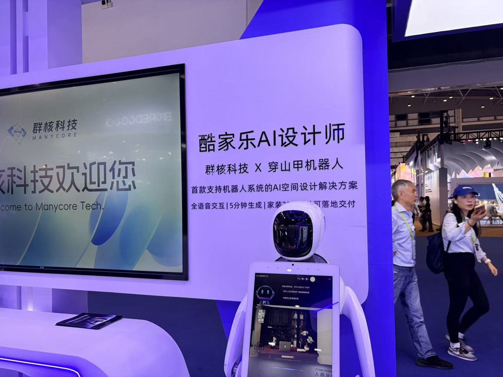 在本屆消博會上,參展企業(yè)群核科技帶來了國內(nèi)首款落地應(yīng)用的實(shí)體家裝AI機(jī)器人設(shè)計(jì)師。觀眾對著機(jī)器人說:“設(shè)計(jì)一套北歐風(fēng)的家裝方案!睅资雰(nèi),一套完整的裝修方案就出現(xiàn)在屏幕上。