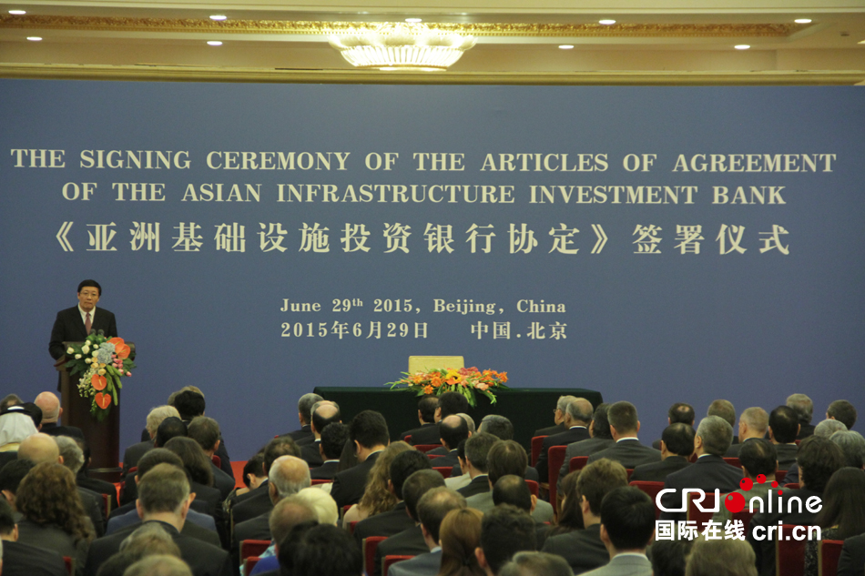 央廣網(wǎng)北京6月29日消息 據(jù)經(jīng)濟(jì)之聲《央廣財(cái)經(jīng)評論》報(bào)道,今天上午,亞洲基礎(chǔ)設(shè)施投資銀行協(xié)定正是在北京簽署,亞投行57個(gè)意向創(chuàng)始成員國財(cái)長或者授權(quán)代表出席了簽署儀式。其中已通過國內(nèi)審批程序的50個(gè)國家正式簽署協(xié)定,這標(biāo)志著亞投行的籌備工作進(jìn)入了新的階段。財(cái)政部部長樓繼偉也在今天的簽署儀式上表示,亞投行協(xié)定是成立亞投行以及投入運(yùn)營后所遵循的基本大法,它將為年底前亞投行正式成立奠定堅(jiān)實(shí)基礎(chǔ)。