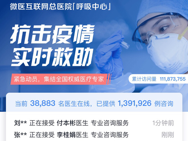 疫情暴發(fā)后,微醫(yī)互聯(lián)網(wǎng)總醫(yī)院立即推出“新冠肺炎實時救助平臺”,截至2月21日9時,累計訪問人次超過1.1億,集結(jié)38952名醫(yī)生在線接診,累計提供醫(yī)療咨詢服務(wù)139.40萬人次。
