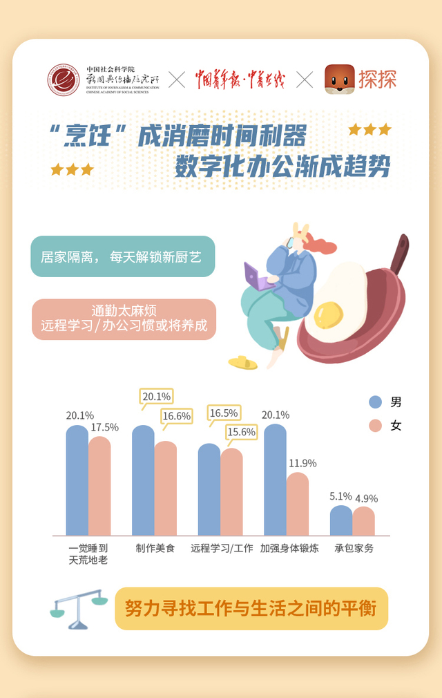 疫情期間,所有人被迫減少外出,這讓年輕人的日常飲食、生活作息等習(xí)慣隨之改變。“解鎖新廚藝”替代了“外賣廚藝”。探探數(shù)據(jù)顯示,36.7%的用戶把“制作美食”當(dāng)成消磨時(shí)間的利器,男人更愛(ài)做飯,烹飪時(shí)間比女性多3.5%;從職業(yè)分布看,在政府、事業(yè)單位的用戶的烹飪意愿更強(qiáng)。疫情讓90后開(kāi)始注意個(gè)人健康和衛(wèi)生,此外,32%的用戶開(kāi)始注重身體鍛煉,26-28歲的年輕人主觀意愿更強(qiáng);87.6%的用戶表示要注意個(gè)人衛(wèi)生,56.7%的用戶表示要早睡早起,對(duì)“按時(shí)體檢”的需求,男性高于女性4.2個(gè)百分點(diǎn)。