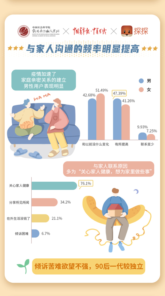 疫情讓人體會(huì)到親情可貴。數(shù)據(jù)顯示,疫情期間四成以上的年輕人和家人溝通的頻率有所提高,與家里聯(lián)系最多的原因是“關(guān)心家人身體健康,想為家里做些事”,其次是“分享所見(jiàn)所聞”,選擇“向家人傾訴困難”的年輕人少之又少。