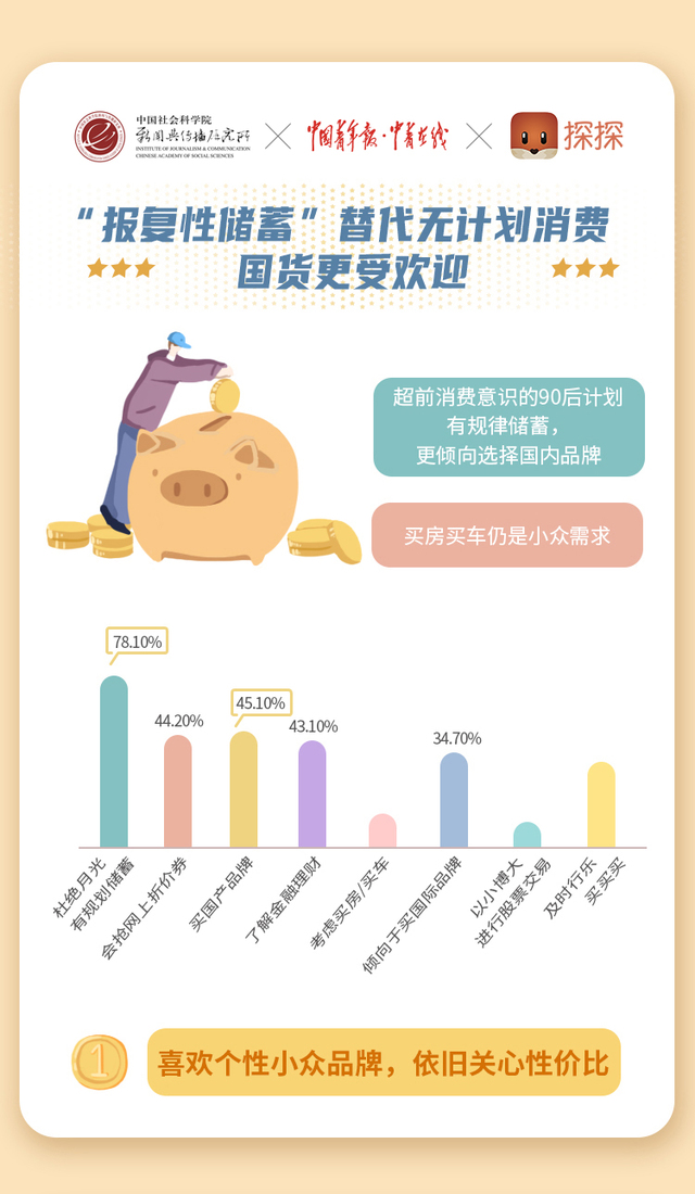 受疫情影響,90后的消費(fèi)觀呈現(xiàn)出“后退”趨勢(shì)。不再盲目選擇國(guó)際大牌,更關(guān)注特色和體驗(yàn),喜歡個(gè)性小眾品牌,關(guān)心性價(jià)比。探探調(diào)查數(shù)據(jù)顯示,關(guān)于理財(cái)規(guī)劃,78.1%的用戶選擇有規(guī)律儲(chǔ)蓄,45.1%的用戶傾向選擇國(guó)內(nèi)品牌,僅有11.1%的用戶考慮買房買車。相比“報(bào)復(fù)性消費(fèi)”,“報(bào)復(fù)性存錢”顯然更具群體共識(shí)。而對(duì)“疫情平穩(wěn)后規(guī)劃”,受訪者選擇依次是聚餐出游、追趕工作進(jìn)度和及時(shí)行樂(lè)。