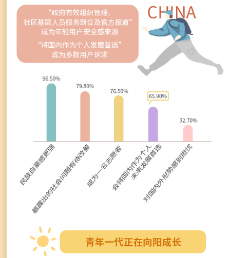 抗擊疫情時(shí)期,90后群體體現(xiàn)出足夠的擔(dān)當(dāng)和愛(ài)國(guó)熱情。調(diào)研的用戶中,11.8%是抗疫一線人員,10.9%表示參與了志愿者等抗疫相關(guān)工作,“國(guó)內(nèi)戰(zhàn)役、復(fù)工復(fù)產(chǎn)、就業(yè)信息”成為群體共同關(guān)注的話題!罢行ЫM織管理、社區(qū)基層人員服務(wù)到位及官方報(bào)道”成為年輕用戶安全感的重要來(lái)源。18-20歲的95后民族自豪感表現(xiàn)更強(qiáng)烈,青年一代正在“向陽(yáng)成長(zhǎng)”。