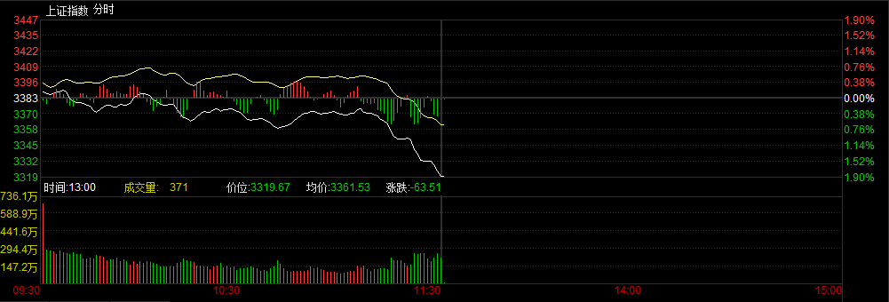 截至午間收盤(pán),滬指報(bào)3319.67點(diǎn),跌幅1.88%,成交2276億元;深成指報(bào)11464.01點(diǎn),跌1.91%,成交1705億元;創(chuàng)業(yè)板報(bào)1721.93點(diǎn),跌幅1.03%,成交150億元。盤(pán)面上板塊多數(shù)翻綠,銀行、石油、港口水運(yùn)、保險(xiǎn)、地產(chǎn)、券商等板塊跌幅居前;僅汽車(chē)、工程、農(nóng)業(yè)等板塊上漲。