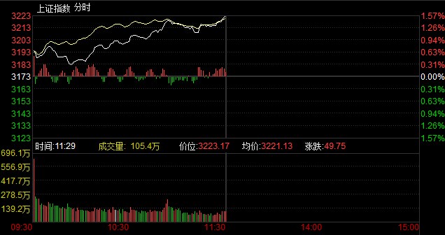 央廣網(wǎng)財經(jīng)北京2月13日消息 據(jù)經(jīng)濟之聲《交易實況》報道,兩市開盤小幅高開,十點十八分滬指站上3200點,一路高走,截至午盤,滬指報3223.17點,上漲49.75點,漲幅1.57%,成交1572億元;深成指報11510.1點,上漲207.44點,漲幅1.84%,成交1511億元;創(chuàng)業(yè)板指報1820.73點,上漲31.92點,漲幅1.78%,成交356.8億元。