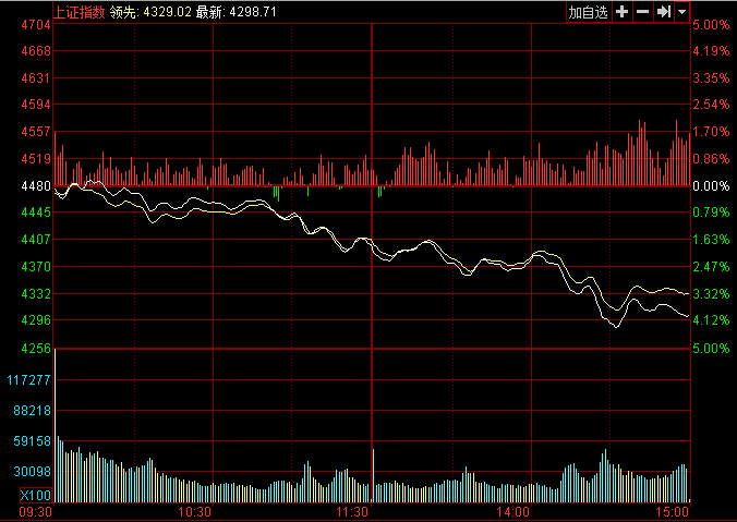 央廣網(wǎng)北京5月5日消息 據(jù)經(jīng)濟(jì)之聲《交易實(shí)況》報(bào)道,周二早盤滬指低開小幅翻紅后震蕩走低,銀行,地產(chǎn),電力等權(quán)重股弱勢(shì),接近11點(diǎn)題材股回落,權(quán)重股跳水,大盤跳水超1%,午后看盤銀行,地產(chǎn)等權(quán)重股延續(xù)上午跳水走勢(shì),滬指再度放量跳水暴跌超4%,滬指盤中跌破4300點(diǎn)整數(shù)關(guān)口。截止收盤滬指報(bào)4298.71點(diǎn),跌幅4.06%,深證指報(bào)14233.10點(diǎn),跌幅4.22%,創(chuàng)業(yè)板報(bào)2783.44點(diǎn),跌幅2.17%。