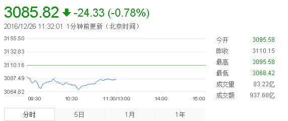 截至午盤,滬指報(bào)3085.82點(diǎn),跌0.78%,成交額937.68億;深成指報(bào)10115.58點(diǎn),跌0.83%,成交額1154.16億;創(chuàng)業(yè)板報(bào)1946.31點(diǎn),跌0.93%,成交額304.81億。