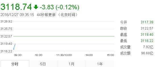 央廣網(wǎng)北京12月27日消息 據(jù)經(jīng)濟(jì)之聲《交易實(shí)況》報(bào)道,今日大盤低開,截至開盤,滬指報(bào)3117.39點(diǎn),跌0.17%,深成指報(bào)10229.91點(diǎn),跌0.03%,創(chuàng)業(yè)板報(bào)1972.51點(diǎn),跌0.08%。