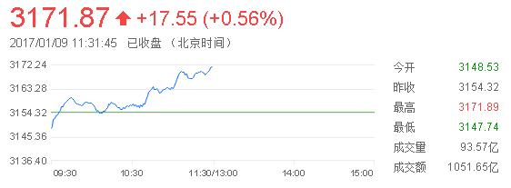 截止午盤收盤,滬指報3171.87點,漲幅0.56%,成交量1052億元;深指報10331.67點,漲幅0.41%,成交量1258億元;創(chuàng)業(yè)板指報1965.6點,漲幅0.03%。