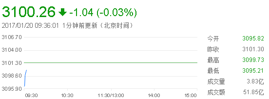 截至開盤,滬指報(bào)3087.03點(diǎn),跌0.53%;深證成指報(bào)9,684.53點(diǎn),下跌28.27點(diǎn),跌幅0.29%;創(chuàng)業(yè)板報(bào)1824.10點(diǎn),跌0.37%。