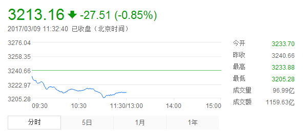 央廣網(wǎng)北京3月9日消息 據(jù)經(jīng)濟(jì)之聲《交易實(shí)況》報(bào)道,今日滬深兩市股指早盤低開(kāi)低走,滬指盤中一度跌超1%,報(bào)3205.28,創(chuàng)兩會(huì)以來(lái)新低。創(chuàng)業(yè)板早盤低開(kāi),隨后受盤中主題熱點(diǎn)缺乏影響,指數(shù)持續(xù)低位震蕩。截止午盤,滬指報(bào)3213.16,跌0.85%,創(chuàng)業(yè)板指報(bào)1957.90,跌0.34%。