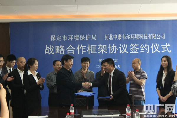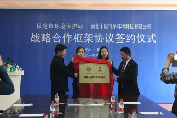 保定市環(huán)保局局長肖寶元(左)、中康韋爾總經(jīng)理陳龍(右)分別代表雙方在戰(zhàn)略合作框架協(xié)議書上簽字并為“智能環(huán)保聯(lián)合實(shí)驗(yàn)室”揭牌。