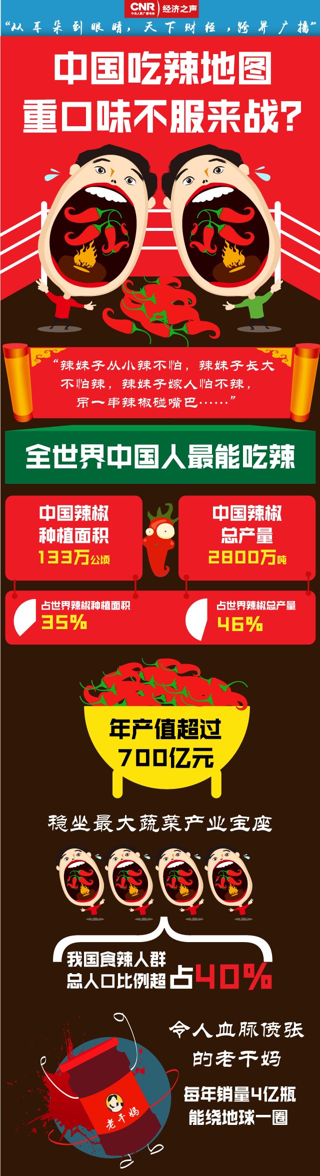 央廣網(wǎng)北京3月4日消息 據(jù)經(jīng)濟之聲《天下財經(jīng)》報道,中國吃辣地圖,重口味不服來戰(zhàn)?我國食辣人群總?cè)丝诒壤?0%,令人血脈噴張的老干媽每年銷量4億瓶,能繞地球一圈。