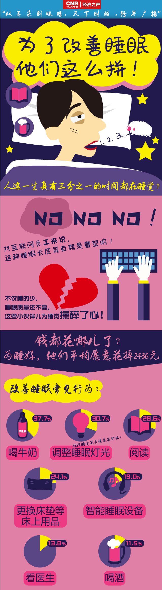 央廣網(wǎng)北京4月29日消息 據(jù)經(jīng)濟(jì)之聲《天下財經(jīng)》報道,人這一生真有三分之一的時間都在睡覺?no,對互聯(lián)網(wǎng)員工來說這種睡眠簡直就是奢望吶。不僅睡的少,睡眠質(zhì)量還不高,這些小伙伴為睡覺操碎了心!