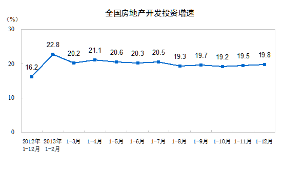 2013年,全國房地產(chǎn)開發(fā)投資86013億元,比上年名義增長19.8%(扣除價格因素實際增長19.4%),增速比1-11月份提高0.3個百分點,比2012年提高3.6個百分點。其中,住宅投資58951億元,增長19.4%,增速比1-11月份提高0.3個百分點,占房地產(chǎn)開發(fā)投資的比重為68.5%。