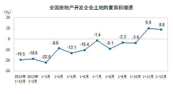 2013年,房地產(chǎn)開發(fā)企業(yè)土地購置面積38814萬平方米,比上年增長8.8%,增速比1-11月份回落1.1個百分點;土地成交價款9918億元,增長33.9%,增速提高2.4個百分點。