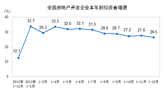 2013年,房地產(chǎn)開發(fā)企業(yè)到位資金122122億元,比上年增長26.5%,增速比1-11月份回落1.1個百分點,比2012年提高13.8個百分點。其中,國內(nèi)貸款19673億元,增長33.1%;利用外資534億元,增長32.8%;自籌資金47425億元,增長21.3%;其他資金54491億元,增長28.9%。在其他資金中,定金及預(yù)收款34499億元,增長29.9%;個人按揭貸款14033億元,增長33.3%。