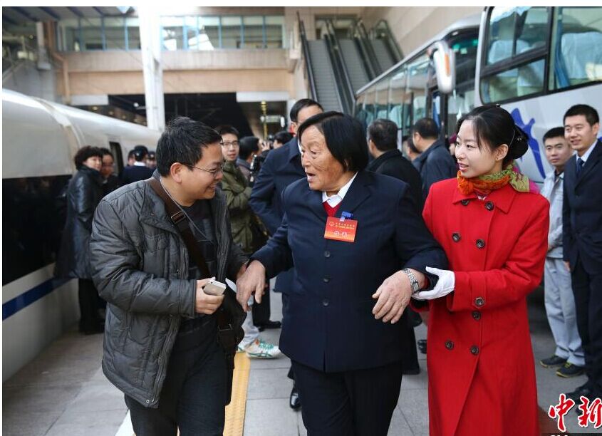 3月2日,參加十二屆全國人大三次會(huì)議的山西代表團(tuán)乘火車抵達(dá)北京。圖為申紀(jì)蘭代表抵達(dá)。
