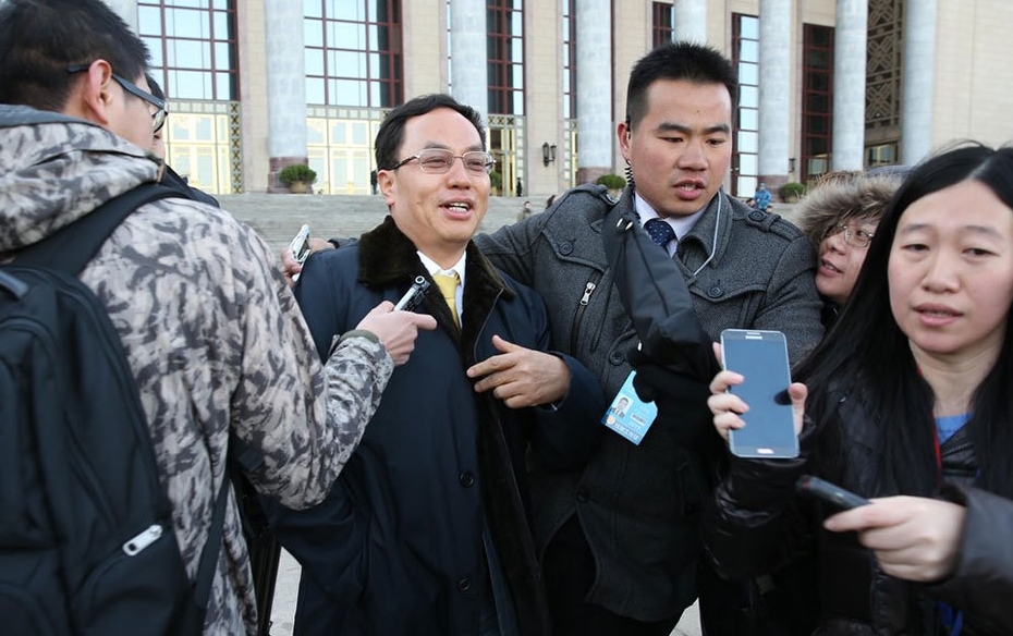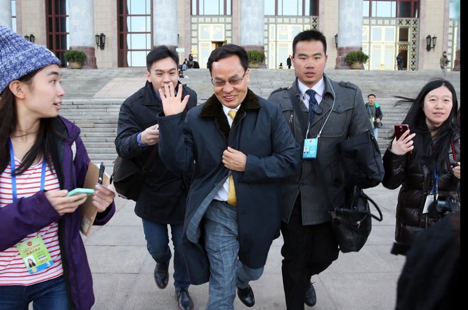 3月3日,全國(guó)政協(xié)十二屆三次會(huì)議開(kāi)幕,會(huì)后漢能控股董事局主席李河君一路奔跑躲避記者采訪。