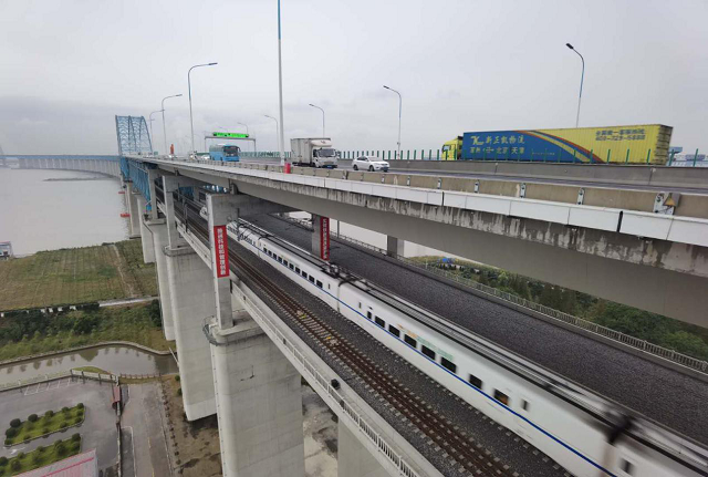 滬蘇通長(zhǎng)江公鐵大橋,橋下高鐵和橋上車輛并行通過(guò)。