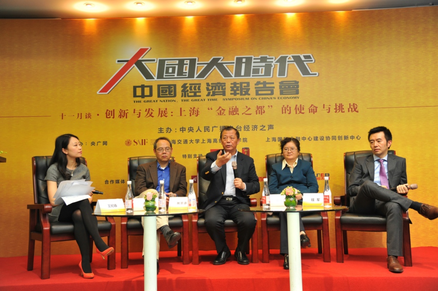 左起:經(jīng)濟之聲節(jié)目主持人紀(jì)春、上海交通大學(xué)上海高級金融學(xué)院執(zhí)行院長、金融學(xué)教授張春、國務(wù)院參事室特約研究員姚景源、國務(wù)院發(fā)展研究中心金融研究所所長張承惠、上海交通大學(xué)上海高級金融學(xué)院金融學(xué)教授、中國金融研究院副院長錢軍