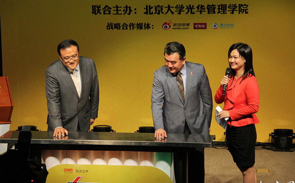 中央人民廣播電臺(tái)臺(tái)長(zhǎng)王求(左二)和北京大學(xué)光華學(xué)院黨委書記冒大衛(wèi)(左一)握手