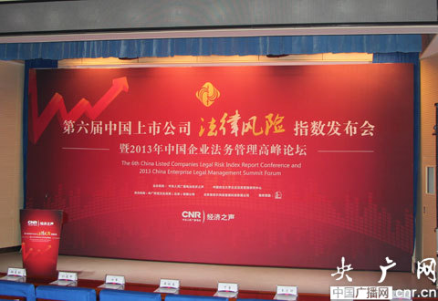 央廣網(wǎng)財(cái)經(jīng)北京12月8日消息 由中央人民廣播電臺(tái)經(jīng)濟(jì)之聲、中國政法大學(xué)中國企業(yè)法務(wù)管理研究中心共同主辦的第六屆中國上市公司法律風(fēng)險(xiǎn)指數(shù)報(bào)告暨2013年中國企業(yè)法務(wù)管理高峰論壇8日在京舉行。會(huì)議發(fā)布了《2013中國上市公司法律風(fēng)險(xiǎn)指數(shù)報(bào)告》。