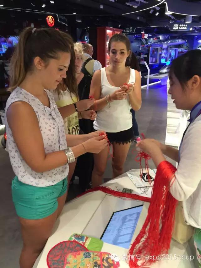 老外游客們?nèi)耸忠桓t線繩,在志愿者的示范引導下,認真地穿線繞繩,打成一個個寓意吉祥的中國結,打得最好的游客可以獲得一件時尚絲巾的獎勵。志愿者也會為一些游客送上精心打好漂亮的中國結。外國游客紛紛驚嘆這種來自中國的時尚元素,把一根簡單的紅線可以加工成如此美好的飾件。