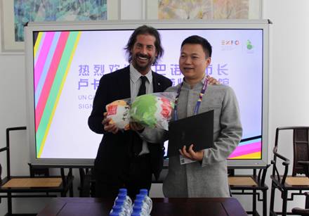 意大利溫泉協(xié)會主席、阿巴諾市市長盧卡·克勞狄奧和中企館執(zhí)行館長王慧(林小軍 攝)