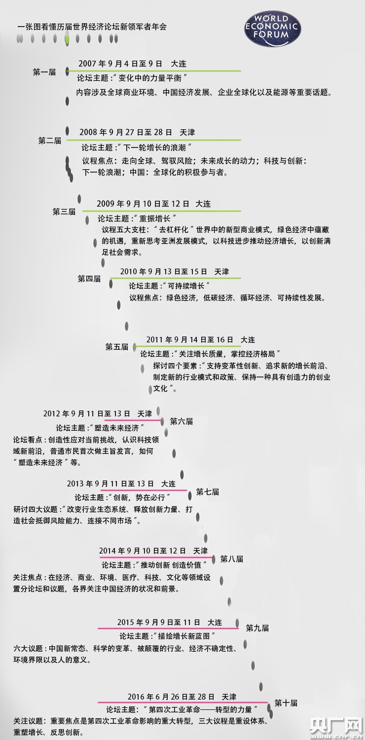 央廣網(wǎng)天津6月28日消息(記者張海振)世界經(jīng)濟(jì)論壇新領(lǐng)軍者年會是世界500強(qiáng)企業(yè)同最有發(fā)展?jié)摿Φ脑鲩L型企業(yè)、同各國各政府間對話的非官方國際性機(jī)構(gòu),討論全球性熱點(diǎn)問題,觀察世界經(jīng)濟(jì)發(fā)展,“致力于改善全球狀況”。2007年,首屆世界經(jīng)濟(jì)論壇新領(lǐng)軍者年會(夏季達(dá)沃斯論壇)在中國大連舉辦,自此,在中國開始了每年一屆的夏季達(dá)沃斯論壇。截至2016年,世界經(jīng)濟(jì)論壇新領(lǐng)軍者年會在中國舉辦了十屆,每一屆達(dá)沃斯的主題是什么、重點(diǎn)議題是什么,一張圖讓你看懂每屆夏季達(dá)沃斯論壇。