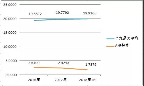 從榮獲了“九鼎獎”的9家上市公司的凈資產(chǎn)收益率(2018年為年化數(shù)據(jù),算術平均,下同)來看,不僅顯著高于A股所有公司的凈資產(chǎn)收益率平均值,而且在最近3年中指標表現(xiàn)平穩(wěn);即便是在2018年上半年市場整體盈利壓力較大的條件下,這9家公司依然能夠錄得平穩(wěn)的凈資產(chǎn)收益率。
