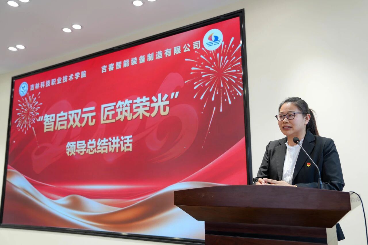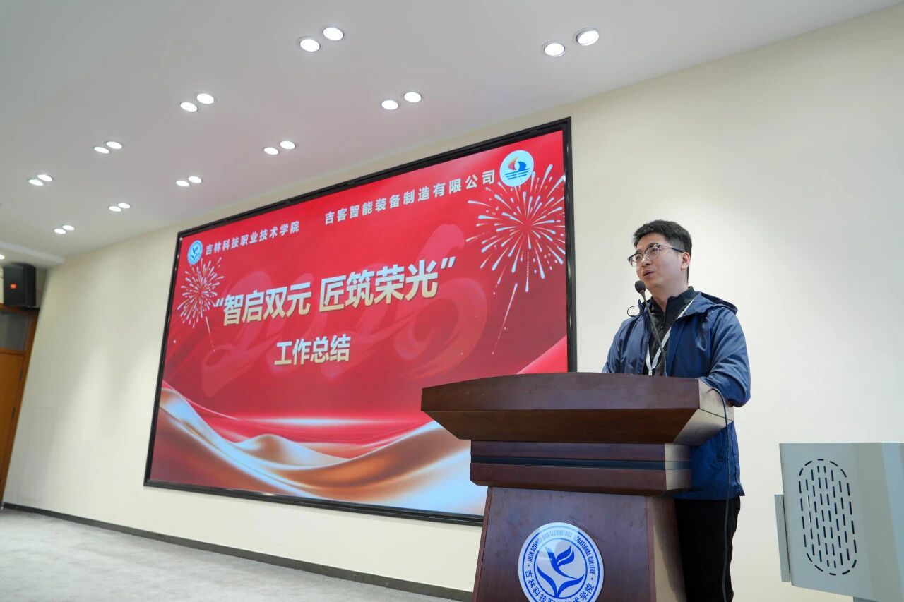 大會伊始,吉林省吉客智能裝備制造有限公司項目經(jīng)理劉海東作項目階段性總結(jié)。他表示,項目始終堅持以“真崗位、真訂單、真項目、真場景”為核心,將企業(yè)真實研發(fā)與設(shè)計場景引入課堂,把完整工作流程融入日常教學(xué),組建由企業(yè)工程師與校內(nèi)專業(yè)教師聯(lián)手的雙導(dǎo)師團(tuán)隊,實行全程駐校、手把手實操指導(dǎo),讓學(xué)生在全真職場環(huán)境中錘煉技能、增長才干,實打?qū)嵚涞亍绊椖?人才雙交付”育人模式。