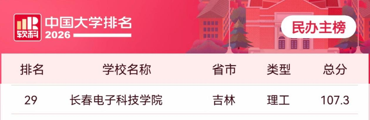 4月15日,高等教育評價(jià)權(quán)威機(jī)構(gòu)軟科正式發(fā)布2026中國大學(xué)排名,長春電子科技學(xué)院憑借綜合辦學(xué)實(shí)力穩(wěn)步提升,位列民辦高校主榜第29名,充分展現(xiàn)了以光電為特色的高水平現(xiàn)代產(chǎn)業(yè)大學(xué)硬核實(shí)力!