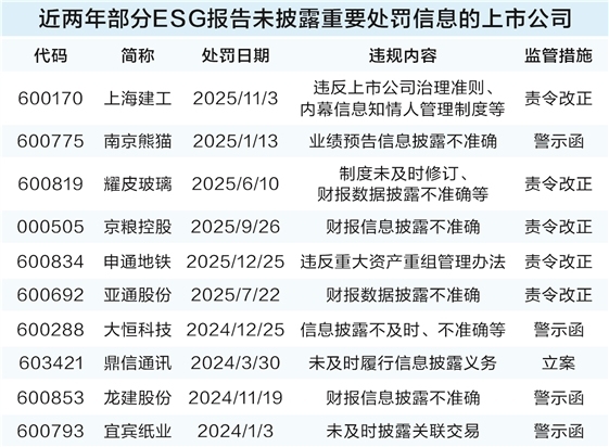 例如2025年1月南京熊貓因業(yè)績預告與實際業(yè)績差異較大、凈利潤盈虧性質發(fā)生變化的信息披露不準確事項被出具警示函;2025年9月京糧控股因子公司開展的貿易無商業(yè)實質或收入確認不符合會計準則規(guī)定被責令改正,相關信息均未在ESG報告中體現(xiàn)。