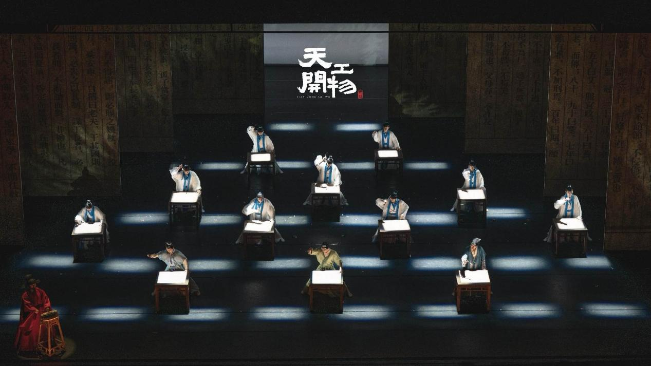 在具體舞臺(tái)呈現(xiàn)上,導(dǎo)演陸川將電影蒙太奇思維融入舞劇編排,以獨(dú)舞聚焦宋應(yīng)星的彷徨與堅(jiān)守,用群舞鋪展農(nóng)耕、冶鐵、織絲的壯闊圖景!俺閹健敝w語言精準(zhǔn)復(fù)刻古代勞作場景,雙層紗幕與全息投影構(gòu)建出超現(xiàn)實(shí)空間:織機(jī)化作舞者的骨骼,稻穗流轉(zhuǎn)成金色韻律,陶瓷燒制時(shí)釉色隨動(dòng)作幻變,虛實(shí)交織間完成“火淬文明”的隱喻。全劇貫穿123幅明代版畫元素,絲弦雅樂與打鐵號(hào)子交織成配樂,將明制美學(xué)“大、巧、簡”的精髓詮釋得淋漓盡致。