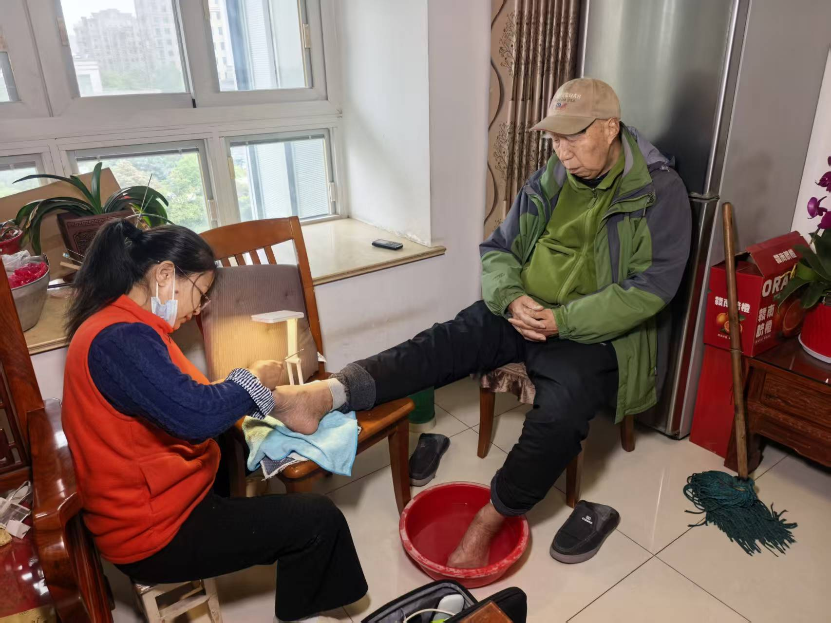 溫情服務(wù),細(xì)致入微;顒赢(dāng)天,網(wǎng)格員與修腳技師分組入戶。每到一戶,工作人員都先與老人親切交談,了解身體狀況與足部不適,幫助老人放松情緒。隨后,技師調(diào)試水溫為老人泡腳,輕柔修剪趾甲、打磨厚繭、清理死皮。針對灰指甲、足部干裂等問題,技師還現(xiàn)場講解日常護(hù)理知識,提醒老人注意足部保暖與鞋襪選擇。