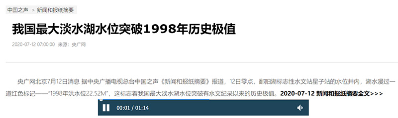 中國(guó)之聲《新聞和報(bào)紙摘要》報(bào)道:我國(guó)最大淡水湖水位突破1998年歷史極值