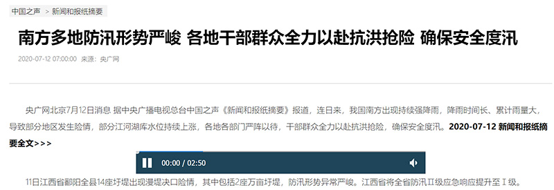 中國(guó)之聲《新聞和報(bào)紙摘要》報(bào)道:強(qiáng)降雨導(dǎo)致我國(guó)南方汛情嚴(yán)峻 各地全力應(yīng)對(duì)