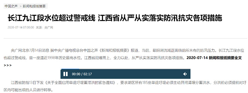 中國(guó)之聲《新聞和報(bào)紙摘要》報(bào)道:長(zhǎng)江九江段水位超過(guò)警戒線 江西省從嚴(yán)從實(shí)落實(shí)防汛抗災(zāi)各項(xiàng)措施