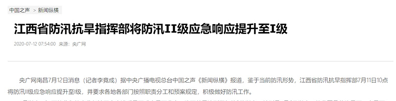 中國(guó)之聲《新聞和報(bào)紙摘要》報(bào)道:江西省防汛抗旱指揮部將防汛Ⅱ級(jí)應(yīng)急響應(yīng)提升至Ⅰ級(jí)