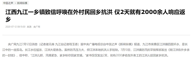 中國(guó)之聲《新聞和報(bào)紙摘要》報(bào)道:江西九江一鄉(xiāng)鎮(zhèn)致信呼喚在外村民回鄉(xiāng)抗洪 僅2天就有2000與人響應(yīng)返鄉(xiāng)