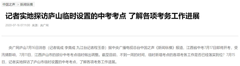 中國(guó)之聲《新聞縱橫》報(bào)道:記者實(shí)地探訪廬山臨時(shí)設(shè)置的中考考點(diǎn) 了解各項(xiàng)考務(wù)工作進(jìn)展