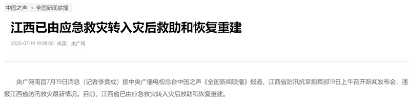 中國(guó)之聲《全國(guó)新聞聯(lián)播》報(bào)道:江西已由應(yīng)急救災(zāi)轉(zhuǎn)入災(zāi)后救助和恢復(fù)重建
